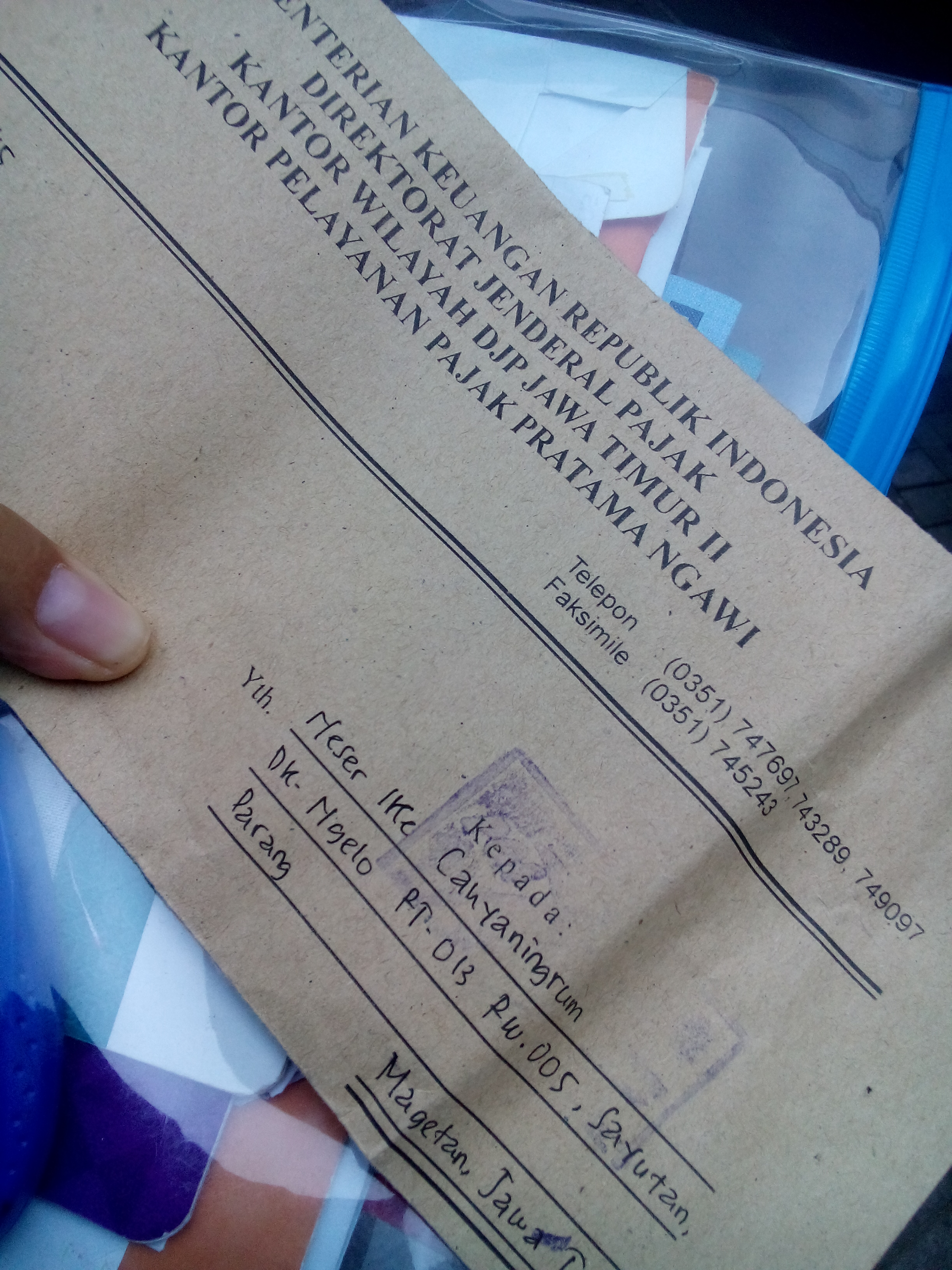 Ini bermula ketika tiba-tiba Ibuk sms yang isinya ada surat dari KPP Ngawi yang isinya Surat Tagihan Pajak. Seingatku bulan Maret 2015 kemarin sih aku ngisi SPT lengkap, pakai e-filling. Aku sampe buka-buka email buat nyari bukti penerimaan e-filling. Ada kok. Dan akhirnya Ibuk bilang kalau ternyata itu untuk pelaporan SPT tahun 2013.