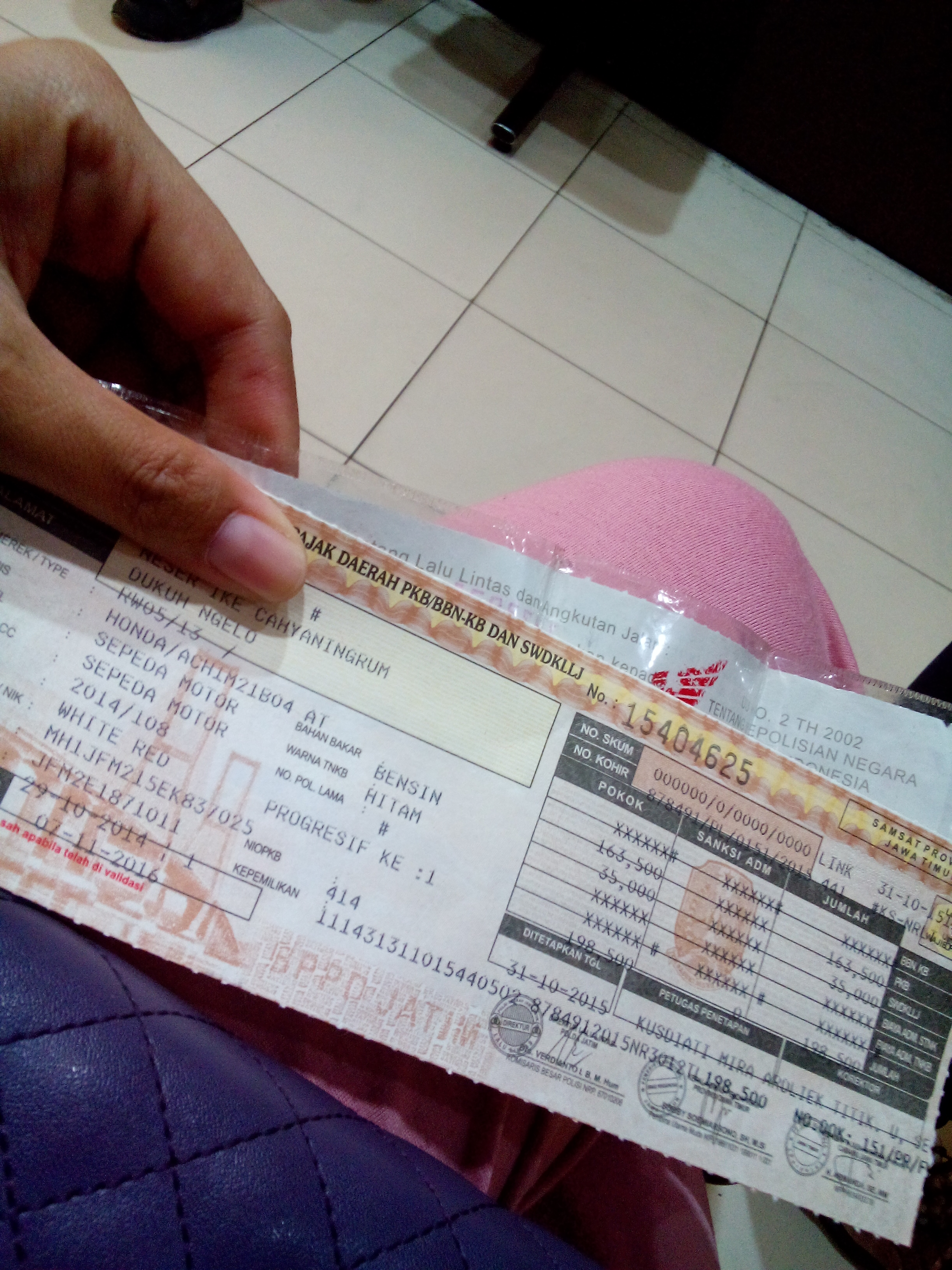 Tidak menunggu lama, aku bergeser ke petugas yang sebelahnya untuk menyerahkan uang pembayaran pajak kendaraan bermotor. Tidak lama kemudian, tanda bukti pembayaran pajak pun diserahkan. WOW, simpel. Aku tidak perlu cuti, tidak perlu pulang kampung, tidak perlu melewati jalan offroad Sayutan- Parang, tidak perlu antri, seperti biasa yang aku lakukan ketika membayar pajak kendaraan bermotor di Magetan.