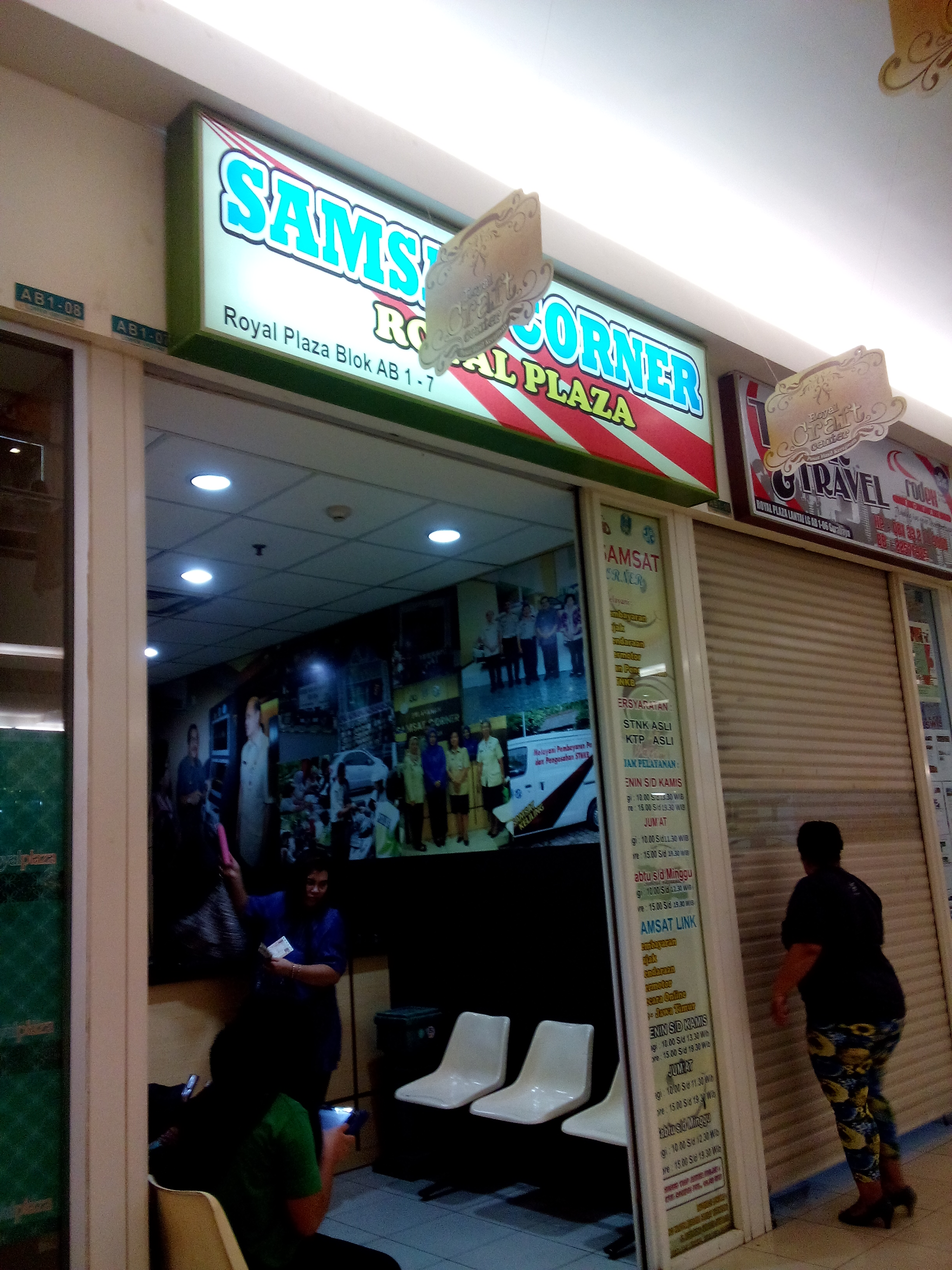 Sabtu itu, aku datang ke Samsat Corner di Royal Plaza. Sekitar pukul 11.00 aku sampai di Royal. Aku menuju ke Samsat Corner yang terletak di Lantai LG, satu lantai dengan Hypermart.Ukuran Samsat Corner ini cukup kecil, dan hanya ada dua orang petugas. Pas sampai di sana, kebetulan sedang sepi dan tidak ada antrian. Aku menyerahkan STNKku beserta KTP kepada petugas pria di sana. Aku pun bertanya, sampai jam berapa Samsat Corner ini bukanya. Bapaknya bilang kalau hari ini buka sampai jam 12, karena ini akhir bulan.