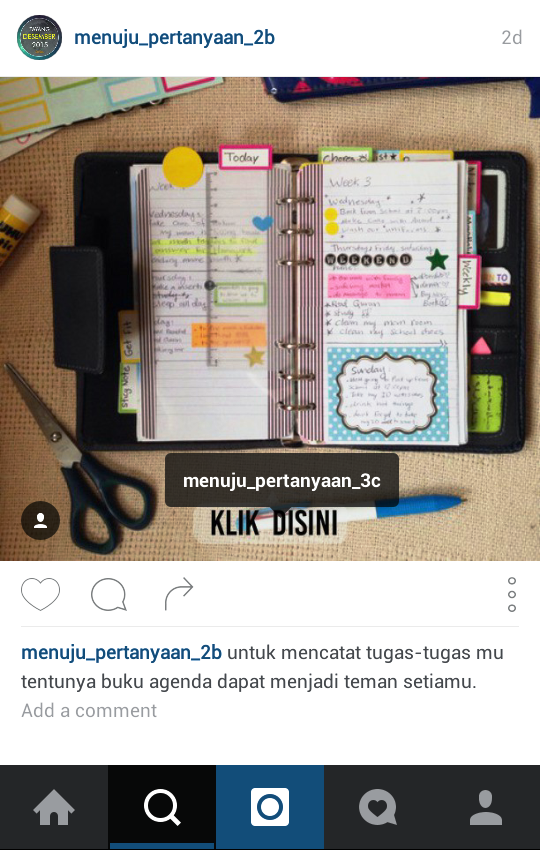 Setelah memilih Candi Borobudur, aku terhubung dengan akun @menuju_pertanyaan_2b. Pertanyaan dalam akun ini adalah “Barang apakah yang tak pernah lepas darimu?”. Dari 9 jenis barang, aku memilih gambar notebook alias buku agenda. Meskipun aku tidak setiap saat membawa agenda, tapi smartphone-ku sudah mulai beralih menjadi agenda. Beberapa catatan penting sudah beralih dalam Notes di smartphone.