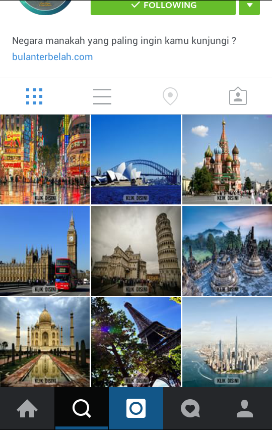 Ketika kita tap gambar “Start Here” tersebut, kita akan terhubung ke akun @btdla_quiz_start. Pada akun @btdla_quiz_start sebagai pertanyaan pertama ini, pertanyaannya adalah “Negara manakah yang paling ingin kamu kunjungi?”. Setiap jawaban yang kita pilih akan terhubung ke akun lain. Dan setiap akun akan memiliki satu pertanyaan pula. Dalam pertanyaan pertama ini ada 9 pilihan jawaban, berisi beberapa gambar ikon wisata di beberapa negara. Aku memilih gambar Candi Borobudur, yang artinya memilih Indonesia, negara sendiri. Bukan karena aku tidak ingin ke luar negeri, tapi negara lain tujuan pertamaku adalah Arab Saudi