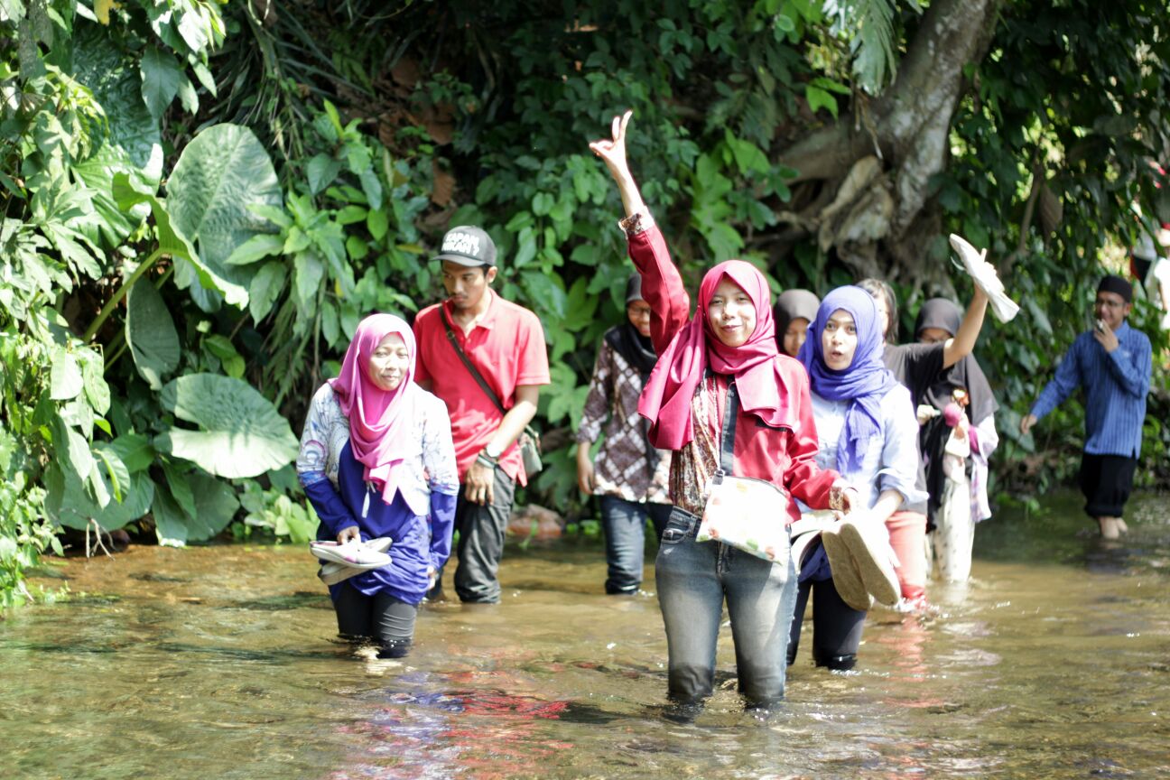 Semua galau mau nyemplung atau ga, tergoda dengan airnya yang bening dan terlihat segara. Beberapa relawan pun nyebur. Aku sebenarnya pingin banget, tapi kondisi lagi ga mendukung untuk nyebur. Bersama 3 relawan lain yang ga ikut nyebur, kami tetap menyeburkan kaki kami ke sungai kecil yang ada di deket sumber, sambil tetap main air.