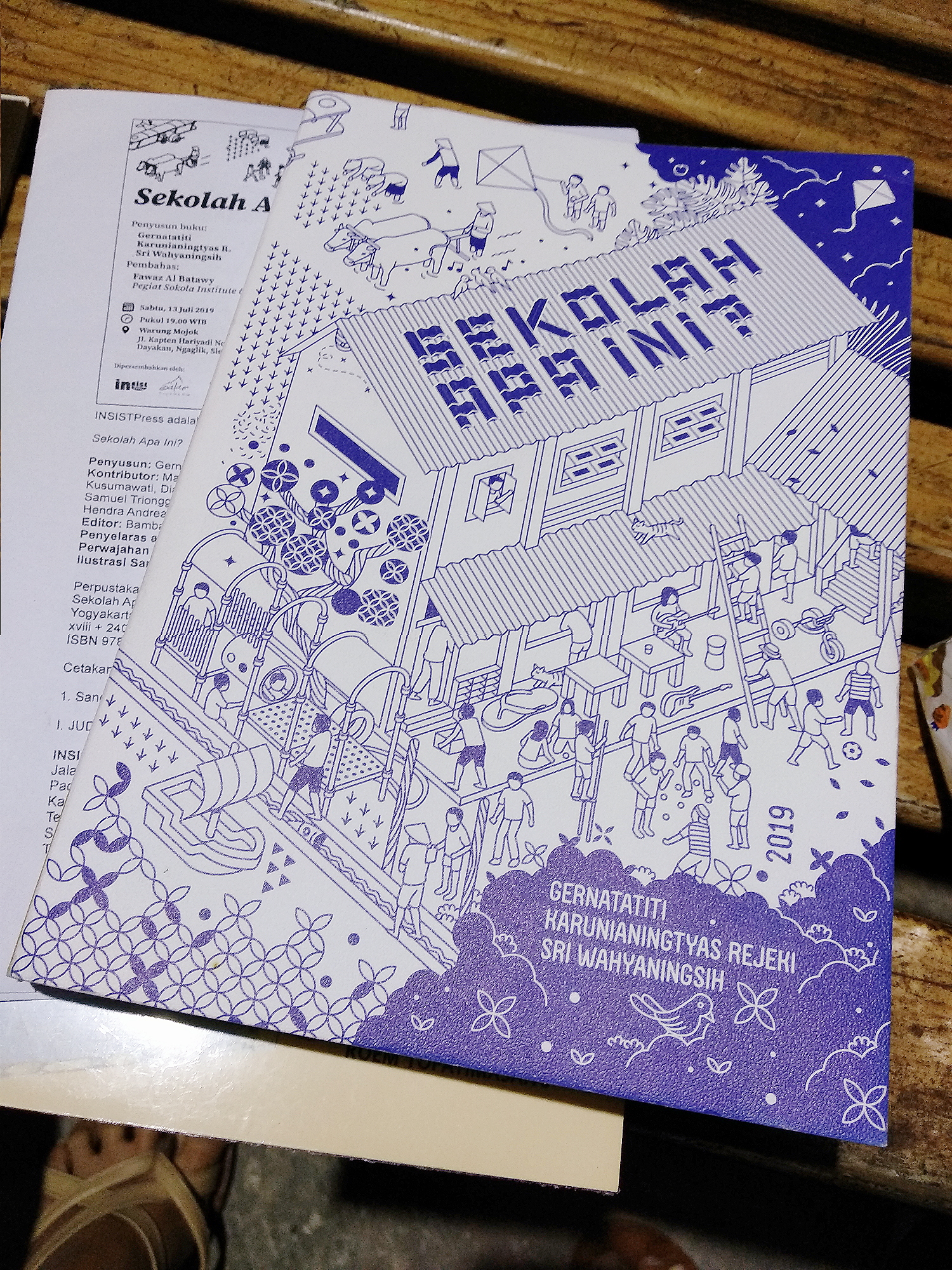 Sambil menunggu acara, peserta bedah buku diberi beberapa lembar kertas fotokopian yang ternyata merupakan fotokopian dari bagian epilog buku “Sekolah Apa Ini?”. Epilog ini ditulis oleh Roem Topatimasang, pendiri INSIST, yang juga menerbitkan buku ini. Buku “Sekolah Apa Ini?” sendiri disusun oleh para pegiat di SALAM, Gernatatiti dan Karunianingtyas Rejeki beserta pendiri SALAM, Ibu Sri Wahyaningsih yang lebih akrab dipanggil Bu Wahya.