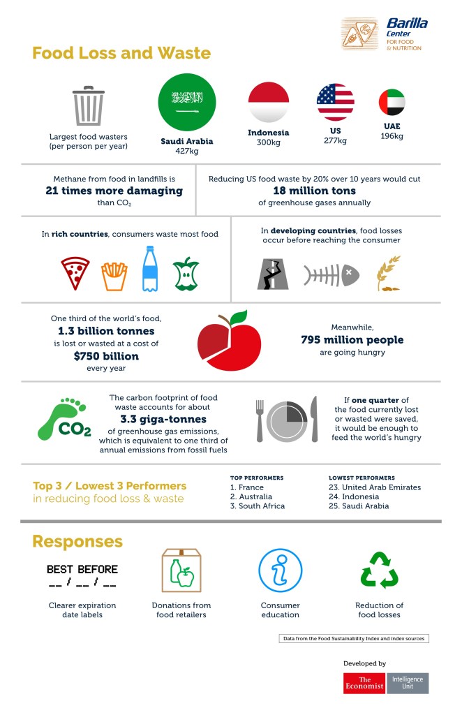 The Economist Intelligence Unit telah mengeluarkan infografis tentang food waste di dunia. Hasilnya, Indonesia berada di peringkat ke-2 negara dengan sampah makanan per orang terbesar di dunia, setelah Saudi Arabia. Dalam setahun, satu orang di Indonesia bisa membuang sampah makanan sebanyak 300 kg. Kebayang kan 300 kg seberapa banyaknya. Sebuah hal yang menarik buat diselidiki lebih lanjut, 3 dari 4 negara penghasil sampah makanan terbesar di dunia, adalah negara dengan mayoritas penduduk muslim. Padahal di dalam Islam, kita juga diajarkan untuk tidak mubadzir. Sebagai orang Islam, sepertinya saya perlu introspeksi diri nih, bagian mana dari kehidupan saya yang tidak sesuai dengan ajaran tersebut