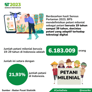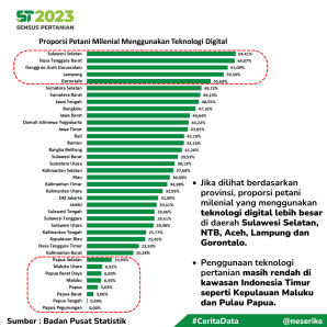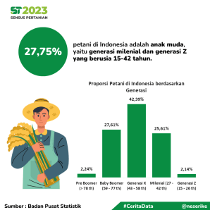 Kebetulan hasil pencacahan Sensus Pertanian 2023 sudah terbit nih, di dalamnya termasuk menampilkan data tentang petani berdasarkan generasi dan petani milenial dalam penggunaan teknologi pertanian.